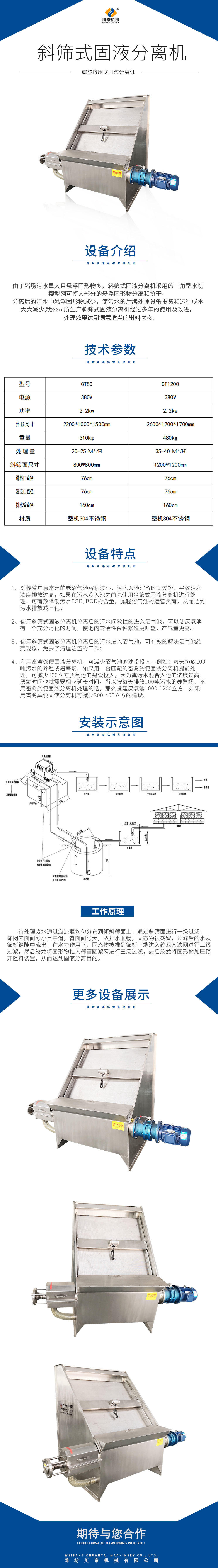 1. 螺旋擠壓式固液分離機(jī)體積小、轉(zhuǎn)速低、操作簡單、安裝維修方便、費(fèi)用省、效率高、投資回收快、不需添加任何絮凝劑。